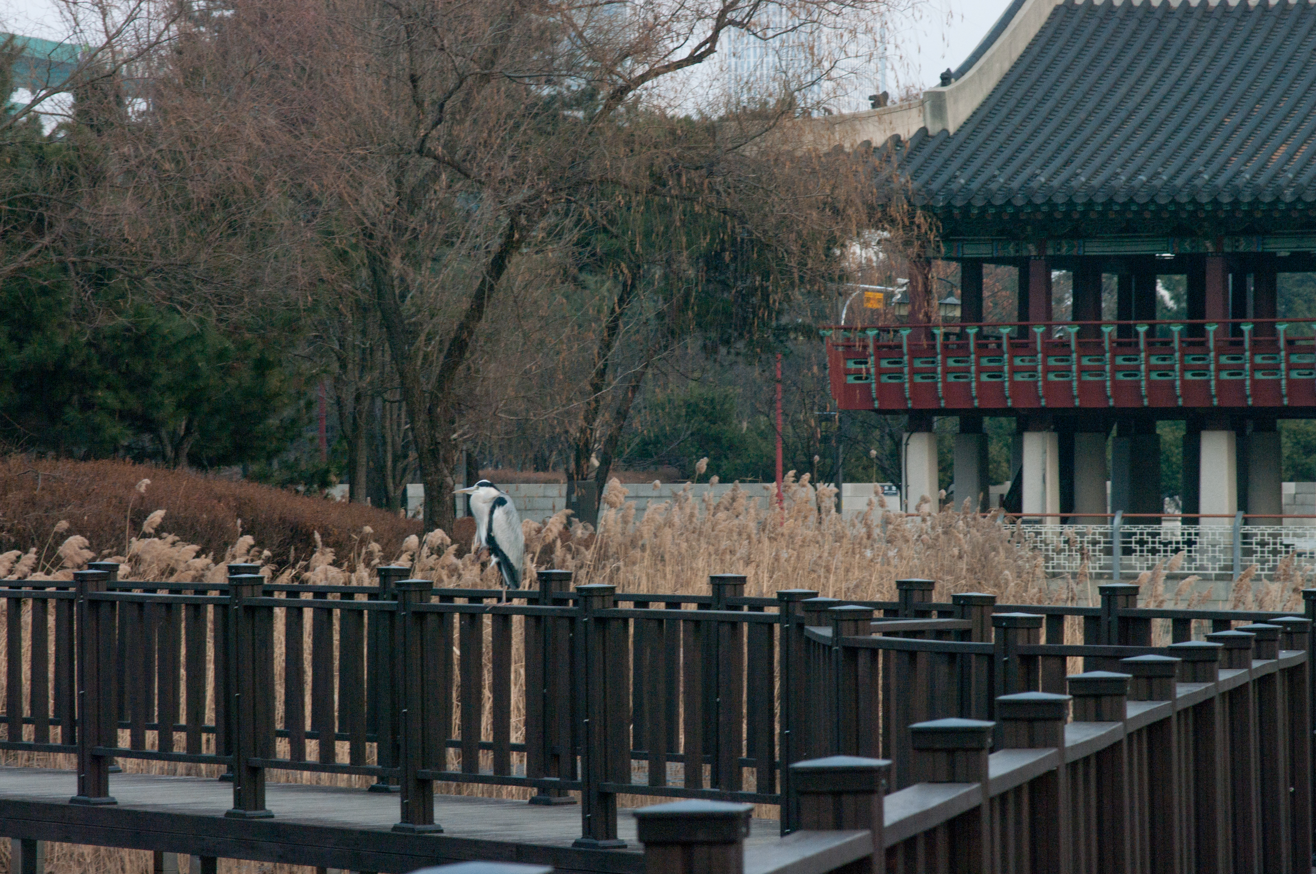 마침 우연히 왜가리와 날아와 목재 난간에 앉았다. 하지만 105mm 렌즈로는 이 거리 이상으로는 다가가지 못한다. 새들마다 일정한 거리 이상으로 다가가지 못하는 거리가 있다. 그 거리를 침범하면 새들은 반드시 날아간다. 105mm로는 이 거리가 최대 한계다. 여기서 한 발자국을 더 옮겼을 때 왜가리는 날아갔다. 망원 렌즈를 가지고 나오지 않은 것을 후회했지만 처음부터 다른 렌즈를 가지고 나올 생각은 없었다.